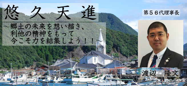 私が天草本渡青年会議所に入会して9年がたちました。入会してすぐは右も左もわからなかった私に先達はまちづくりとは何か、天草地域の発展を目指すということはどのようなものなのかという基礎の部分から学ばせて頂きました。また、私が入会以前の私と共に活動をしたことがない先達からも、お会いする度にご指導、激励を頂く中で、青年会議所の活動の意義やまちづくりを行う事の重要性について私の中で醸成していったと考えています。青年会議所とは、同じ理想と使命感を持つ若い世代の人々を広く集め、友情を深めつつ、強く影響し合い、刺激し合って、若さがもつ未来への無限の可能性を自分たちの手で効果的に描き出し、明るい社会を目指して、青年の情熱から生まれる果敢な行動を結集すべく組織された団体です。本年度、当青年会議所はそれを体現すべく、郷土の未来を想い描き、利他の精神をもち活動してまいります。悠久たる天草の発展を切に願いながら仲 間と共に「英知」と「勇気」と「情熱」を今ここに結集して。
